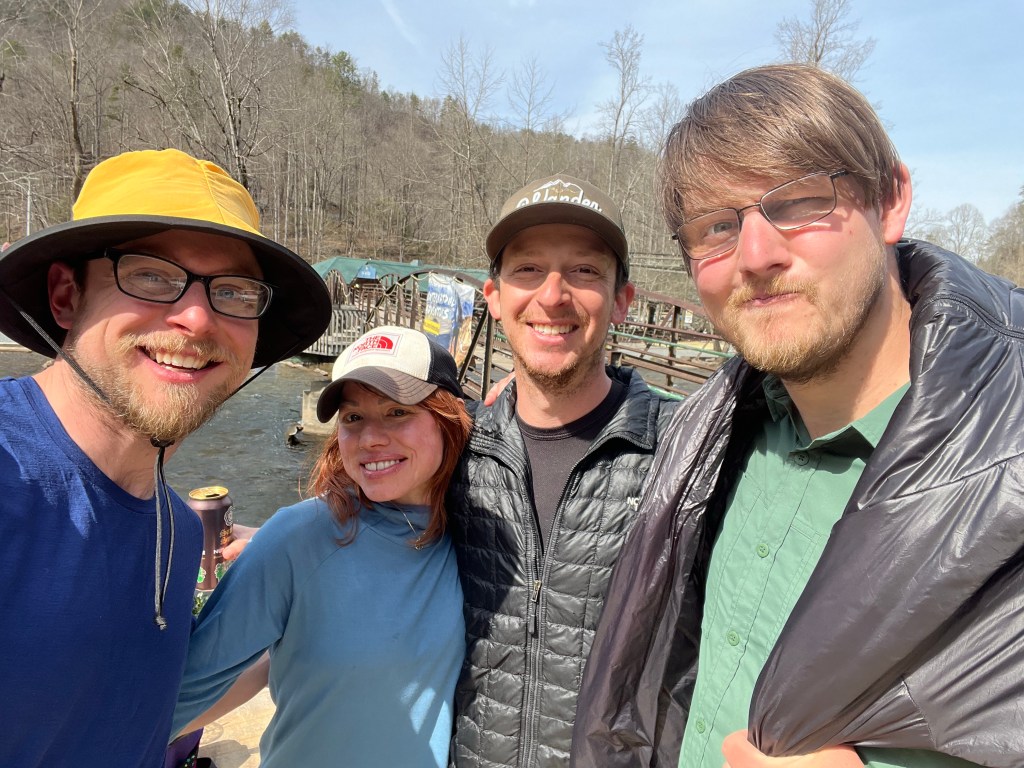 Sprite and I ran into Doug and Kyle along the way. Sprite knew them from her night 1, they stayed in the shelter together. Doug is retired, hiking with his son Kyle. Kyle was wearing all black clothes and a black balaclava. Sprite gave him the trail name Ninja, I think it’s going to stick. I got into the NOC and was happy to run into Corey and Colton. They were kicking back, enjoying a few beverages by the river.