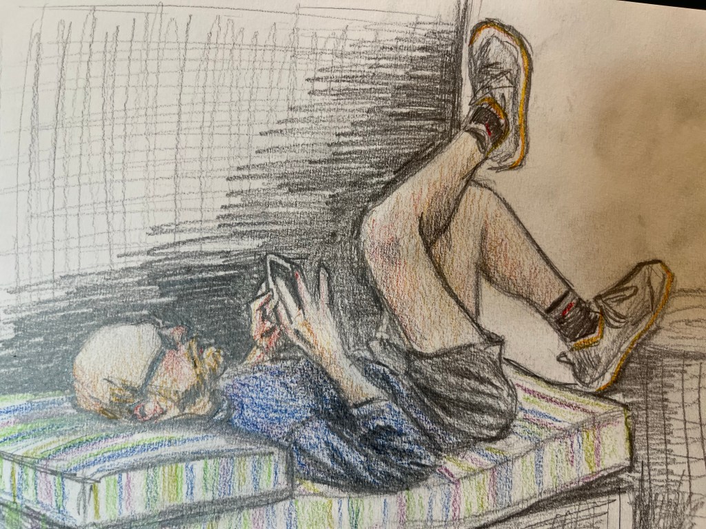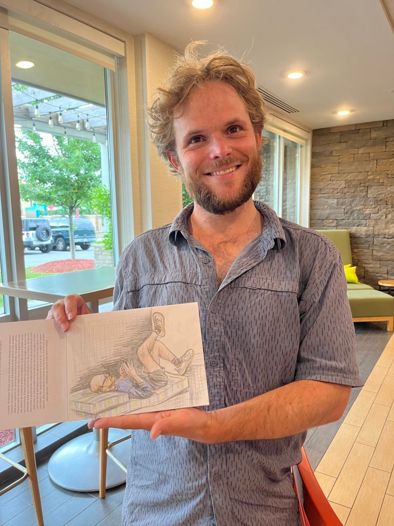 There was a nice patio set outside in the shade, and the weather was perfect. I laid out for a few hours updating the blog. Genie hung out as well and was sketching in his new sketch pad. In case this isn’t proof enough, Genie works as an artist when he isn’t on trail.