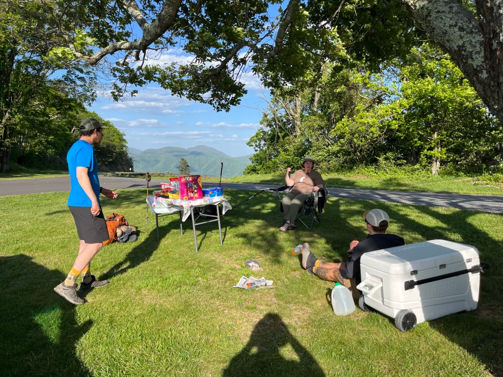 Birthday Sandwich, Dillan, and I were all hanging out at Taylor’s Mountain Overlook when a lady drove up and asked if we were hiking NOBO. When we said yes, she told us there was trail magic two miles up trail with fried chicken. So, we hiked to Harvey’s Knob Overlook (16 miles total to mile 746) and sure enough, we ran into Tree Hugger with a trail magic setup.