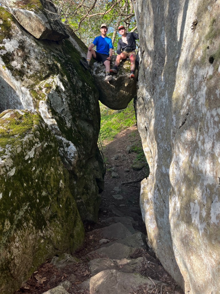 Dillan, Birthday Sandwich, and I then hiked past the “Guillotine” which is a large bolder, over the trail, that is wedged between two larger boulders. Dillan and Birthday Sandwich wanted to sit on it. I volunteered to be the photographer.