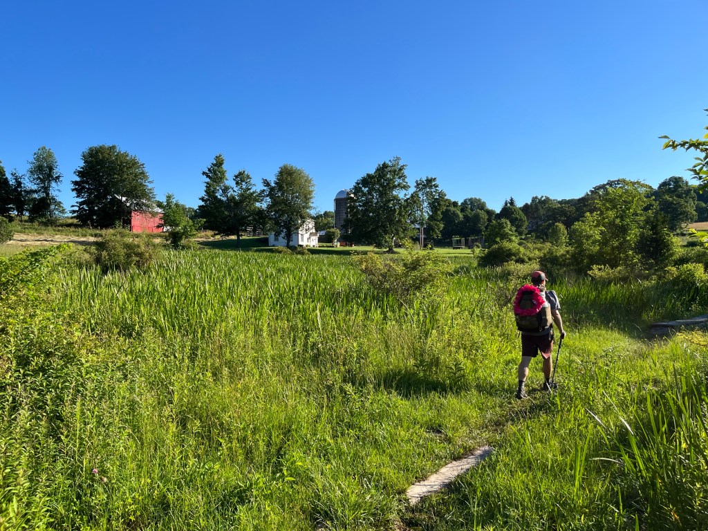 The boardwalk ended at Vernon NJ, and there was a farm stand right off trail. I stopped in with Frodo, and we got ice cream. I then walked over to the hot dog stand across the street and got a late lunch with Frodo, Birthday, and Half Time.