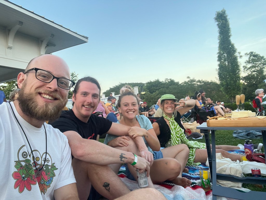 When we were out running around, we stopped at a deli for lunch and ate out on the patio. The weather has been perfect the entire time I’ve been here. When got back to the house, Connor and Angie cooked up stir fry. Taylor joined us for dinner, and then we all headed to a free outdoor concert. We sat out in the grass, snacking on a charcuterie board, with Trent, Victoria, Josh, and a few other friends. The Kitchen Dwellers were playing, which is a great bluegrass band.