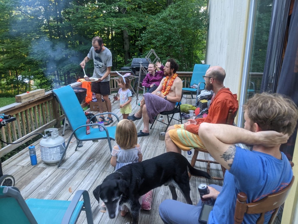 We sat out on their porch for the rest of the evening. Yard Sale made us dinner which was burgers, coleslaw, sweet potatoes, salad, and corn on the cob. His wife, Laura, came home from work that evening. I went to bed shortly after because it was getting late and the mosquitoes were starting to get bad.