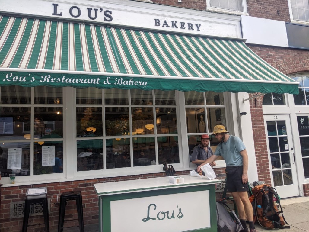 We went to a bakery that gave out free muffins and donuts to thru hikers, and we ate outside the bakery. On two separate occasions, Birthday was mistaken for the hostess. Those were some funny interactions to observe. We then went to a pizza shop that gave out a free slice to thru hikers.