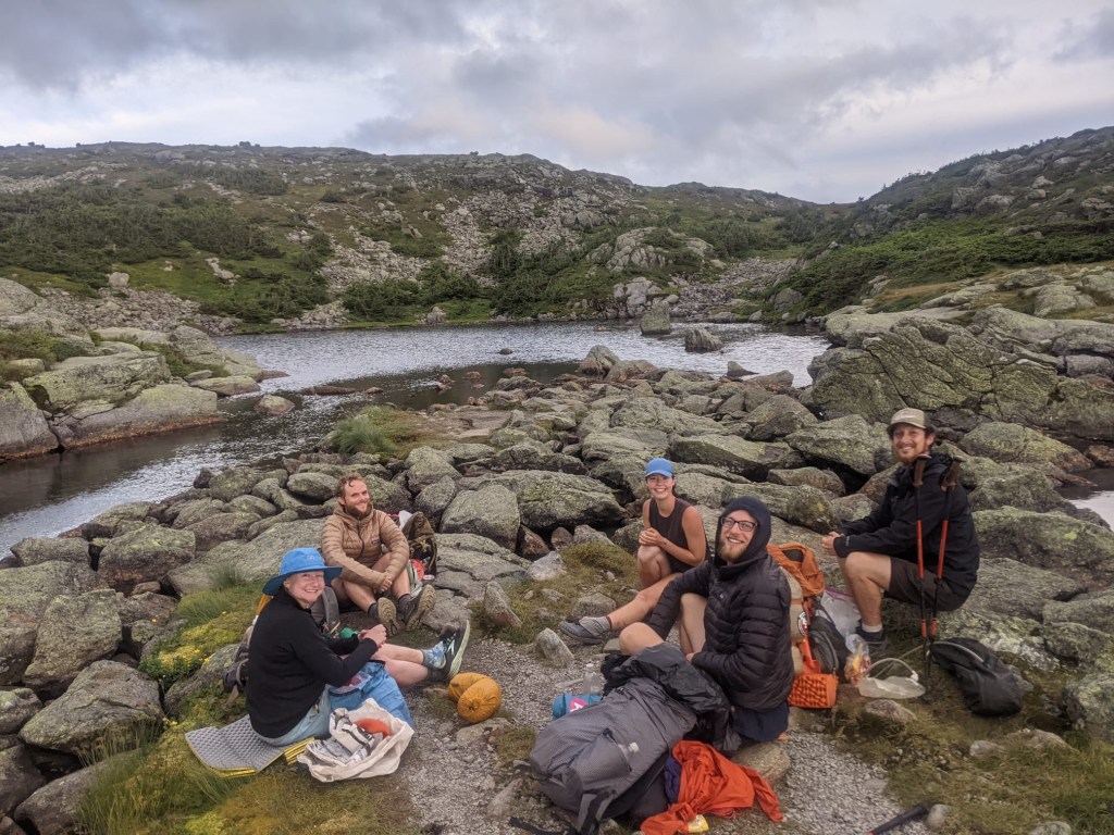 Once we secured a place to sleep, Genie, Aqua, Birthday, and I ate dinner at the lake near the hut. Forest Lorest is another NOBO hiker, and joined us at the lake. After dinner we moved spots so we could watch the sunset.