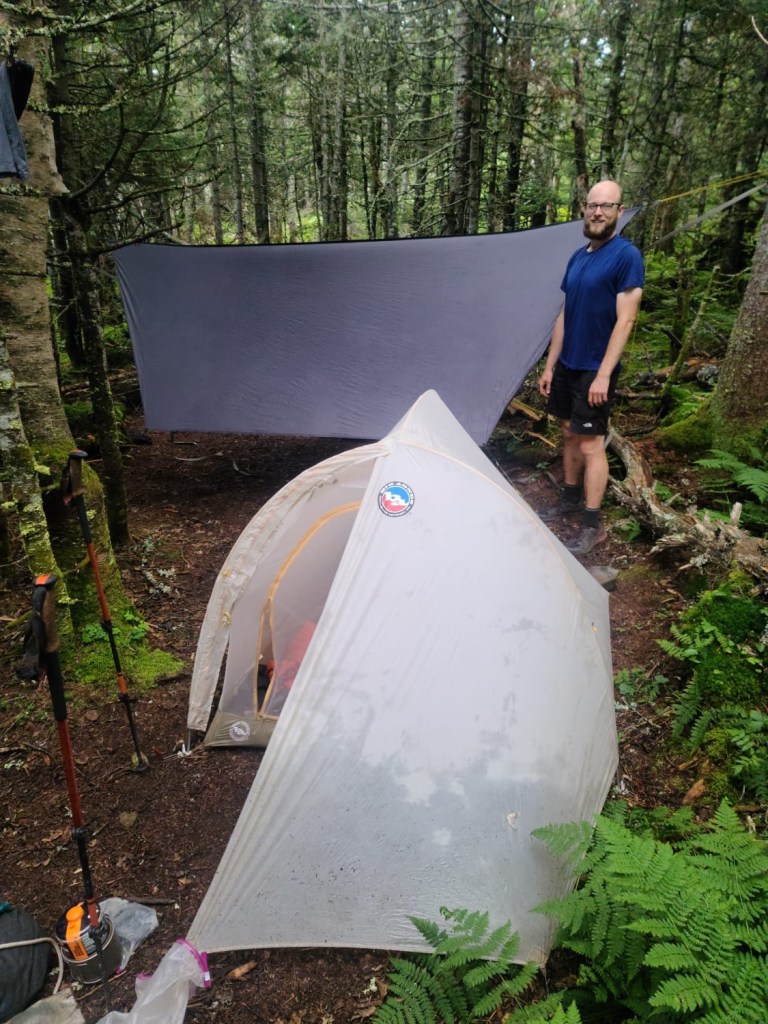 Birthday and I got to South Crocker Mountain, hoping to find a stealth spot, but the good spots were already taken. There was rain in the forecast, so we ditched the idea of finding a campsite to watch the sunset, and hiked into the saddle between South and North Crocker Mountain (Mile 2,000). We found a spot that just barely fit a hammock and a tent, and setup our shelters. We ate dinner just before it started raining. Once it started raining, I made my way to the hammock for the night.