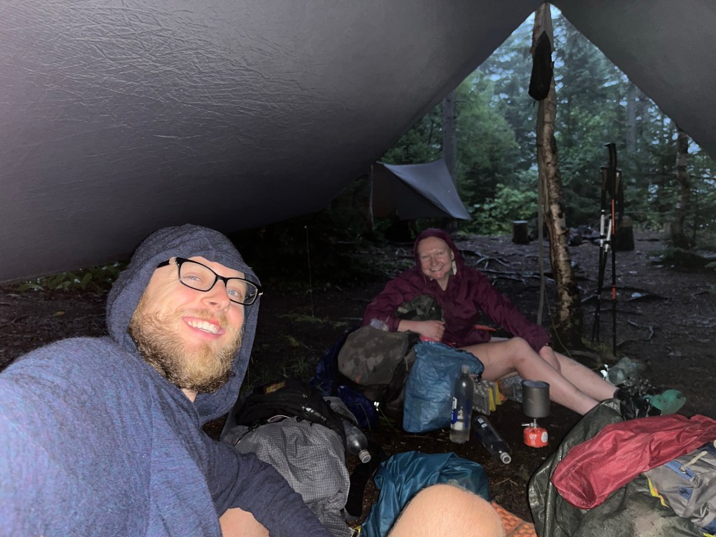 Birthday and I hiked the last 4 miles together into camp. It started raining just before we got to the tent sites at Little Swift River Pond (Mile 1969). I threw up the tarp to get out of the rain. I purposefully didn’t set up my hammock so we could all eat dinner together out of the rain. Aqua, Genie, Splitzy, and Birthday all joined me for dinner under the tarp before bed.