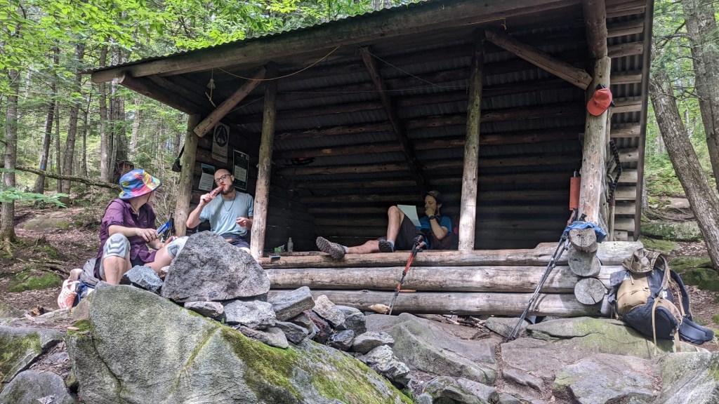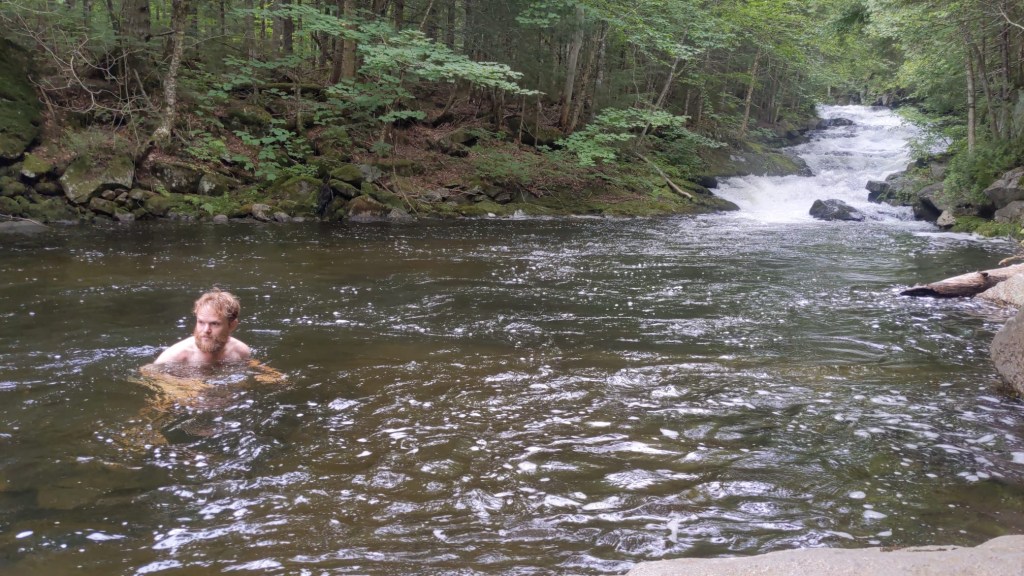 As I was heading back to trail, I ran back into Genie, Splitzy, and Birthday. We all hiked to Cooper Brook Falls Lean-to, where we stopped for lunch. Splitzy and Genie went swimming, while Birthday and I hung out in the shelter. We were reading poetry out of the New Yorker that someone had left in the shelter. I’ve recited some recently, and that inspired Birthday to memorize The Clock Man by Shel Silverstein.